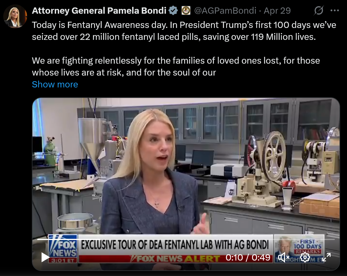 Turns out, all we needed was The Wall, drugs-on-the-table copaganda photo shoots, and dismantling the public health system to save 119 - 258 million lives from fentanyl overdoses in just 💯days. No research can accomplish that!