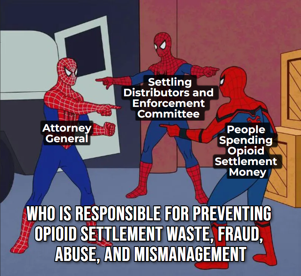 We argue that the AG is responsible for policing this spending because of the legal argument (parens patriae) they used to justify the opioid lawsuits against manufacturers, distributors, pharmacies, and other related groups.